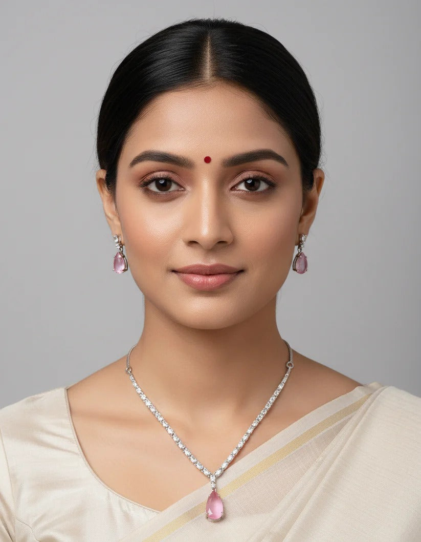PJ-109 - Matte Pink Natural Stone Square Diamonds Silver - Jewelry Set Of 2