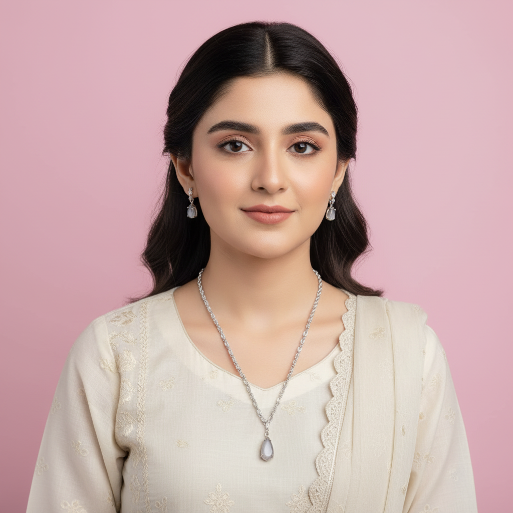 PJ-137 - Mate White Natural Stone Rain Drop Diamonds Silver - Jewelry Set Of 2