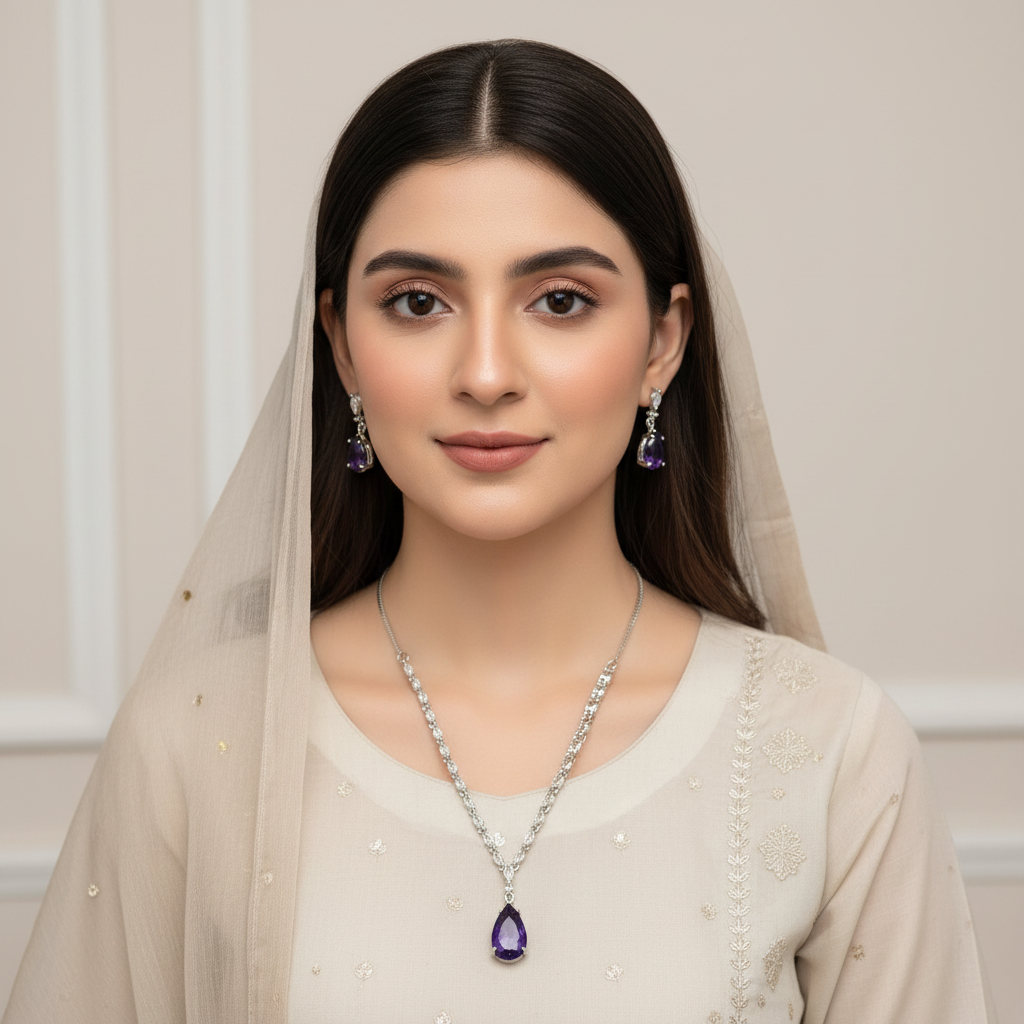 PJ-138 - Crystal Purple Natural Stone Rain Drop Diamonds Silver - Jewelry Set Of 2